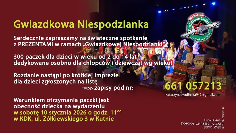 Z radością dzielimy się nagraniem z dużego, charytatywnego wydarzenia pod nazwą Gwiazdkowa Niespodzianka. To były emocje! Była też wartość przesłania oraz duże zainteresowanie Bibliami, które zostały rozchwycone przez chętnych. Wydarzenie było zapowiadane również w Panoramie Kutna >>